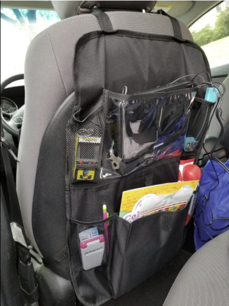 This organization is a life saver! My kids are always losing things under the seat. This organizer has a space for all of their things! There is a space that fits an IPad for long trips. Books fit great in the clear pocket for day to day use. I am impressed by the amount of items that fit in the variety of pockets. My kids always ask for multiple snacks even on short trips. This organizer has spots for snacks, pens/markers, headphones, you name it, there’s a space for it. The pockets at the bottom can fit three chapter or board books. The material can easily be wiped down if it gets dirty. It’s also really easy to install just snap the buckle and tighten. I wish I would have had this organizer when my kids were babies. I would have never needed to pull over and find the dropped toy, binkie, or bottle. I would have had one ready to go safely secured in the organizer. I highly recommend this car organizer because of the range of storage options, the quality, and the ease of installation.